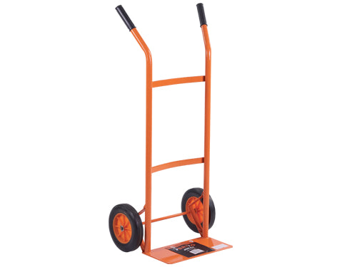 In acciaio tubolare à 25 mm., verniciato a fuoco con ruote 200x40 mm., piano di carico 35x18 cm., spessore 3,5 mm., impugnatura antiscivolo di sicurezza. Portata Kg. 100 .