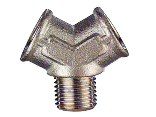 Deviazione a Y con attacco maschio centrale e 2 attacchi femmina. Corpo in ottone nichelato. AS030101 - Filetto M1/4"