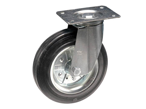 In acciaio stampato zincato con piastra rotante su doppia corona di sfere, anello in gomma piena universal, con mozzo su boccola in nylon. Piastra 100x85 mm. per ruote à 80-100 mm.; Piastra 115x85 mm. per à 125-140 mm.; Piastra 140x110 mm. per à 160-200 mm. . à 125 mm. - Portata max kg. 110