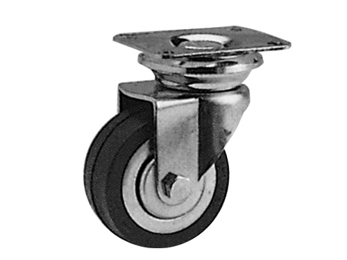 Supporto a forcella in acciaio stampato rotante su corona di sfere, ruota gommata nera su piastra con parafili e flange in acciaio, rotante su cuscinetti a sfera. Ã 60 mm. - HL 93 mm. - Portata max kg. 50