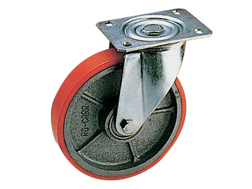 Piastra in acciaio zincato, con ruota in lega di ghisa ricoperta in poliuretano rosso. Piastra 100x85 mm. per ruote à 80-100 mm.; Piastra 115x85 mm. per à 125 mm.. à 125 mm. - Portata max kg. 180