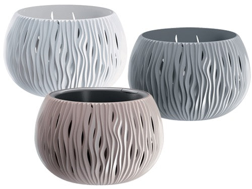 In materiale plastico robusto ad iniezione, vaso interno estraibile, per interno/esterno, resistente a raggi UV e gelo. Decorazione tridimensionale e forata con effetto onde.. Ã29xH19 cm. - Bianco