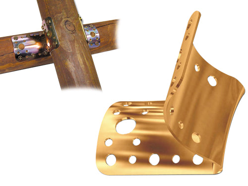 In acciaio tropicalizzato. Piastra giunzione sagomata per legname à 80/100 mm. Dimensioni angolo 65x85 mm. - Spessore 2 mm..