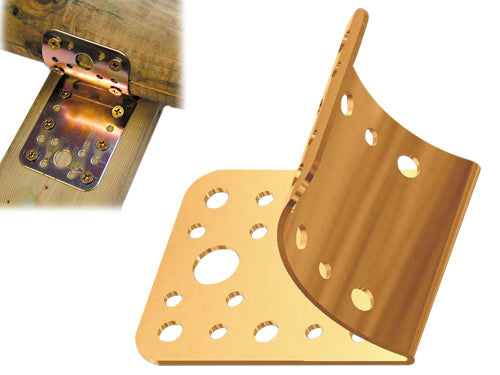 In acciaio tropicalizzato. Piastra giunzione sagomata per legname à 80/100 mm. con piano. Dimensioni angolo 65x85 mm., spessore 2 mm..