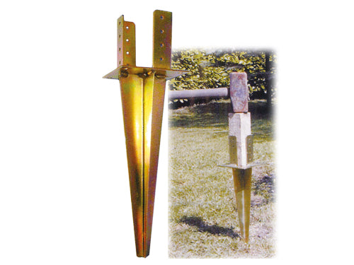 In acciaio. Supporto travi per ancoraggio al terreno (40 cm.). Trave 120x120 mm.