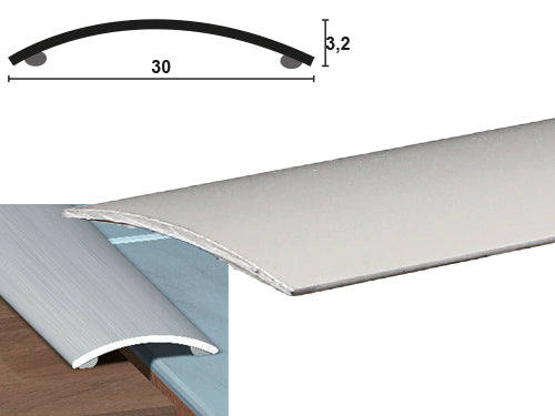 Coprigiunti in alluminio finitura anodizzato satinato, colore argento. Dimensioni 30xH3,2 mm. Con adesivo (applicato a caldo). 024A/90 - Lastra 2,7 mt.