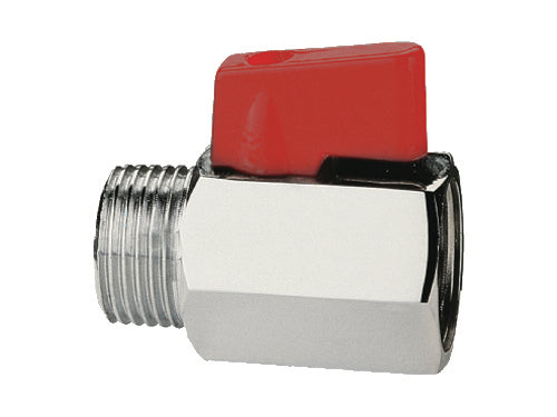 Attacco MF, passaggio totale tipo leggero - corpo valvola e sfera in ottone cromato, maniglia a leva ridotta in alluminio, tenute in teflon. Misura 3/8"
