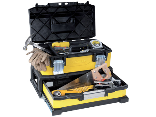 Cassetta portautensili 20" con cassetto, corpo in metallo, vaschetta estraibili, coperchio con scanalatura a V per tagli di assi, cerniere antiruggine lucchettabili, impugnatura ergonomica bi-materiale, cassetto altezza 10 cm. con guide di scorrimento in acciaio con cuscinetti a sfera. Dimensione 54x28x33 cm. Utensili e minuterie non in dotazione.