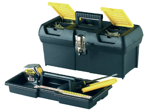 Cassetta 16" con cerniera in metallo, 2 organizer inseriti nel coperchio con apertura indipendente dalla cassetta, vaschetta estraibile, manico a scomparsa. Dimensioni L41xP18x20 cm. Utensili e minuterie non in dotazione.