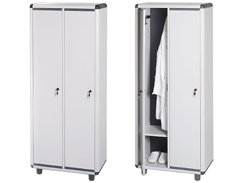In resina con piedini, appendiabiti, piano inferiore, 2 ante con chiave. Colore grigio. Dimensioni L72xP39xH175 cm..