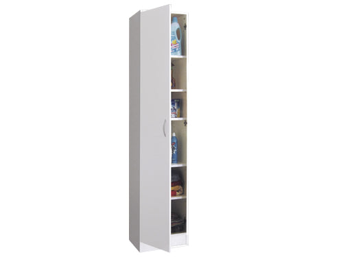 In nobilitato/melaminico spessore 18 mm, schienale in MDF 3 mm. verniciato, 1 anta, maniglia in plastica, 4 ripiani regolabili + 1 fisso. Montaggio a scomparsa (no viti a vista). Dimensioni 40x36xH186 cm..