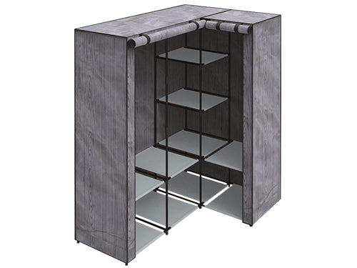 Struttura in acciaio, telo in TNT (tessuto non tessuto), asta portagrucce, ripiani porta oggetti. Dimensioni 131x88x46xH169 cm..
