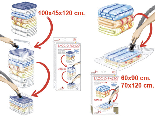 Sacchi salvaspazio sottovuoto per indumenti con valvola ultra piatta. Volume ridotto del 70%. Sacc-o-pazzo 70x120 cm.