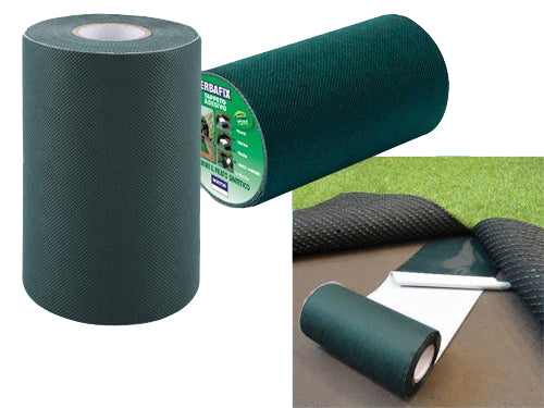Nastro autoadesivo come banda di giunzione e fissaggio per tappeti erba in TNT (tessuto non tessuto) Adatto per utilizzo sia interno che esterno, resiste nel tempo. Dimensioni 150 mm. x 5 mt. - Spessore 155 my.