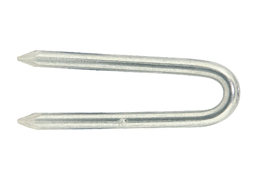 Chiodi a U a doppia punta in ferro lucido, confezionati allineati in scatole di cartone . Misura n° 14x25 mm.