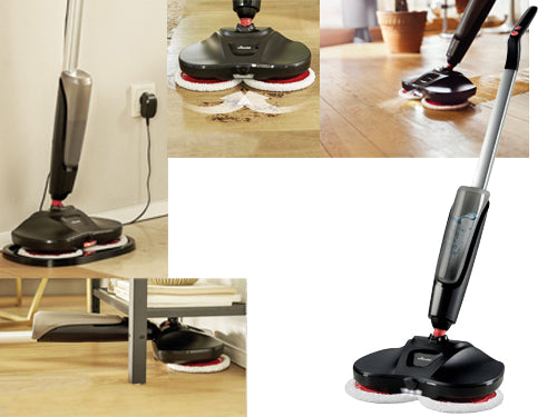 Batteria ricaricabile. Adatto a tutti i tipi di pavimento anche per le superfici più delicate come parquet e laminato, rimuove fino al 99.9% di batteri anche solo con acqua, 2 panni rotanti in microfibra lavabili in lavatrice. Funzione spray per permettere il perfetto dosaggio dellâacqua rispetto al proprio pavimento, serbatoio 450 ml. integrato rimovibile, impugnatura ergonomica. In dotazione caricatore e vassoio salva goccia.