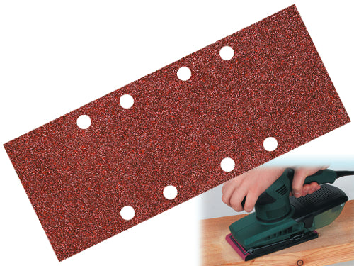 Fogli abrasivi forati al corindone 93x230 mm. per levigatrici orbitali. Per legno e metallo, durata elevata. Confezione 5 Pz. Indicato per: Bosch, Festool, Makita, Metabo, Peugeot, RYOBI, Skil, Stayer, Wagner. Art. 1961000 - Grana 40