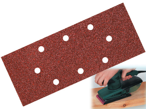Fogli abrasivi forati al corindone 93x230 mm. per levigatrici orbitali. Per legno e metallo, durata elevata. Confezione 5 Pz. Indicato per: Black&Decher, AEG, Bosch, Casals, Einhell, Perles, Peugeot, Worx. Art. 1971000 - Grana 40