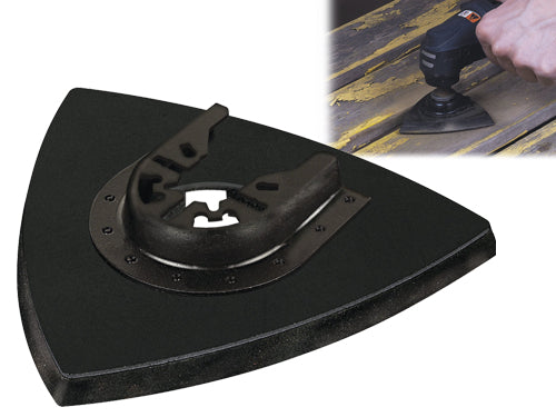 Piastra di supporto velcrata triangolare per strisce abrasive velcro da 95 mm., tessuto velcrato per un rapido cambio della carta abrasiva. Per Utensile multifunzione.