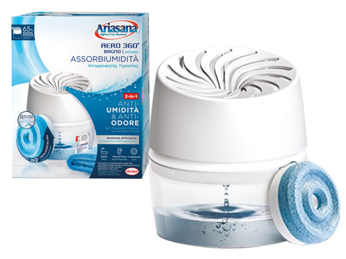 Kit deumidificatore aerodinamico con circolazione dell'aria a 360°. Assorbe lâumidità in eccesso, neutralizza gli odori, ideale per il bagno, gli ambienti umidi e spazi mal isolati con eccesso dâumidità . In dotazione 1 ricariche Tab 450 gr..