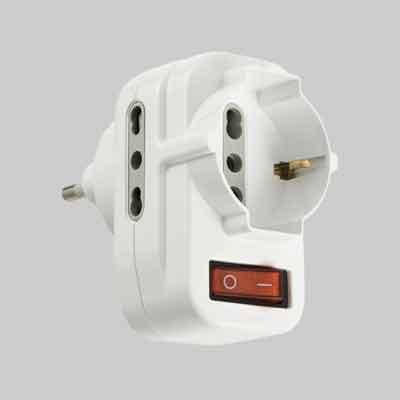 Con interruttore. In tecnopolimero autoestinguente. Presa con alveoli protetti da contatti accidentali, spina girevole con spinotti in ottone nichelato protetti da isolamento. Tensione nominale 250V~50Hz. Potenza massima 1500W. Grado di protezione IP20. Costruite in riferimento alla normativa CEI 23-57. Colore bianco.