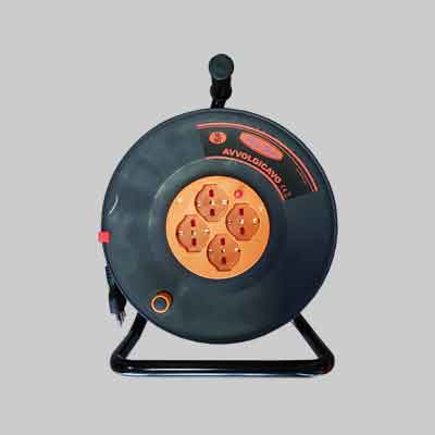 Con cavalletto metallico. Cavo 3G1,5 mm², spina 16A 2P+T, 4 prese schuko/bivalente 10/16A 2P+T, disgiuntore termico.