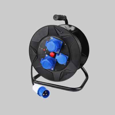 Avvolgicavo con cavalletto, cavo 3*2.5mm2, spina industriale 2P+T 16A, 2 prese industriali 16A 2P+T 230V e una presa Schuko 2P+T. dotato di protettore termico.