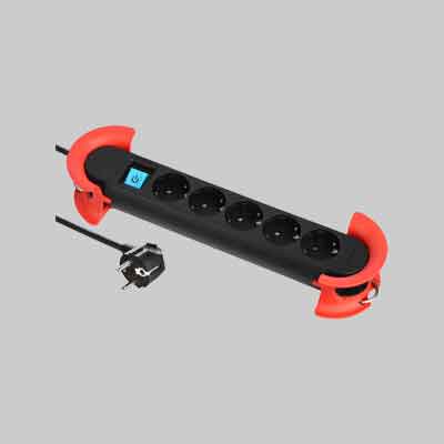 Multipresa professionale con 2 pratici ganci estraibili per appendere la multipresa e fornita con pratico avvolgicavo. Completa di fori per fascette autobloccanti. Prese schuko/bivalente 10/16A 2P+T, spina schuko a 90° 16A 2P+T, interruttore ON/OFF, cavo 3G1,5 mm² lunghezza mt.5. Colore nero.