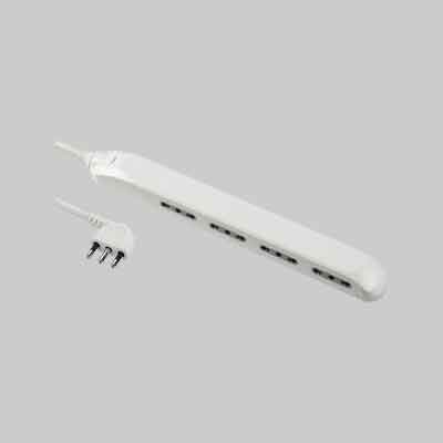 Modello salvaspazio con una larghezza di soli 23 mm. Prese 10/16A 2P+T, spina a 90° 16A 2P+T, lunghezza cavo mt.1,5. Colore bianco.