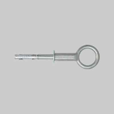 Occhiolo Ø 50 mm in acciaio forgiato, filetto metrico in acciaio zincato con fresatura per chiave, assemblato con ancorante in acciaio a due schermature Ø 16x60 mm. Idoneo per supporti in calcestruzzo e roccia.