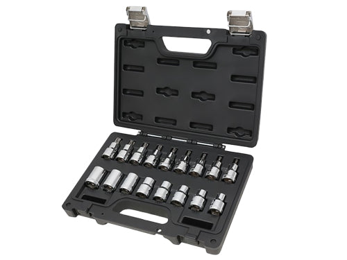 Valigetta con assortimento 17 chiavi a bussola per viti con profilo Torx. Attacco 1/2" Contenuto: 8 Chiavi a bussola Torx attacco quadro - 9 Chiavi a bussola maschio Torx con attacco quadro femmina.