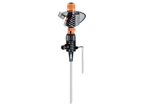 Irrigatore a battente per irrigazione a settori o a giro completo, montato su stabile picchetto a doppio puntale, dispositivo autoregolazione..