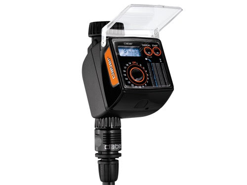 Programmatore automatico a 1 via. Alimentazione con 2 batterie alcaline stilo 1,5 Volt. Facile programmazione, 19 programmi pre-impostati riassunti in uno schema sulla mascherina frontale. Schermo LCD retroilluminato, tasto partenza immediata o ritardata 1-23 ore. Parti elettroniche isolate e assenza di cavi a vista. Attacco rubinetto 3/4" con ghiera pivotante. Filtro lavabile. Pressione d'esercizio da 0,1-12 Bar. Collegabile con il sensore di pioggia Rain Sensor base e al Rain Sensor Radio Frequenza con interfaccia opzionale.