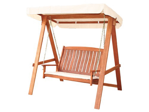 Struttura in legno massello tropicale denominazione Meranti finemente lavorato, trattato con olii protettivi vegetali per garantire la massima resistenza alle intemperie, raccorderia in ottone, completa di cuscino. Dimensioni L166xP123xHmin.164 max 178 cm..