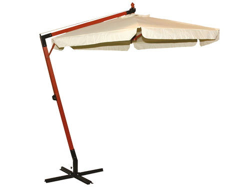 Struttura ad esagono in legno naturale, telo in poliestere 180 gr./mq., con bordo, base di sostegno a croce. Dimensioni à 300 cm., palo 55x55 mm..