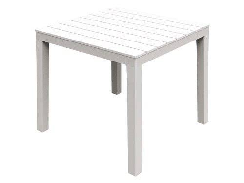 Struttura in resina resistente agli agenti atmosferici, piano effetto doghe legno. Colore bianco. Dimensioni 80x80xH72 cm..