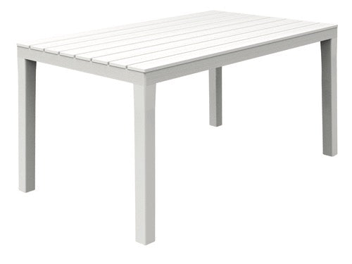 Struttura in resina resistente agli agenti atmosferici, piano effetto doghe legno. Colore bianco. Dimensioni 138x80xH72 cm..
