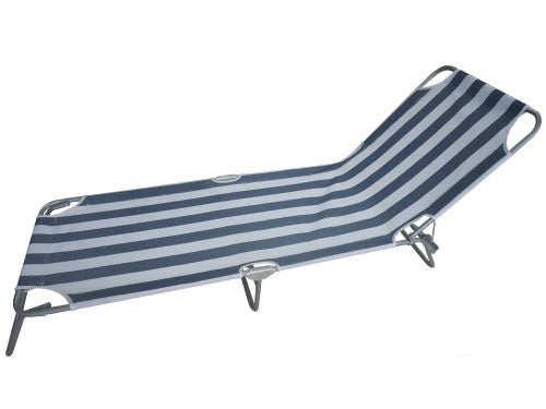 Struttura pieghevole in acciaio tubolare à 18 mm. rivestimento in poliestere 600D., colore blu/bianco a strisce, schienale regolabile e totalmente reclinabile. Dimensioni: 188x58xH25 cm..