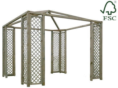 In legno di pino con trattamento autoclavato che consiste nell' immersione del legno in una soluzione salina a pressione che permette alle cellule del legno di aprirsi per assorbire meglio la soluzione impregnante che salvaguardano il legno dagli agenti atmosferici, funghi, muffe, insetti. Dimensioni 300x300 cm. - Altezza centro 250 cm. - Pali montanti 7x7 cm. - Grigliati angolari 40x210 cm. Telo di copertura non in dotazione Prodotto con legno certificato FSC® ovvero proveniente da foreste gestite in maniera corretta e responsabile secondo rigorosi standard ambientali, sociali ed economici..