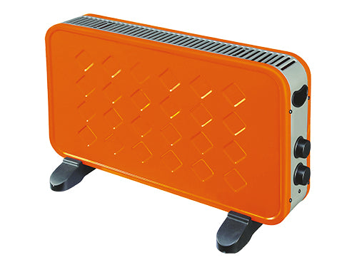 2 potenze selezionabili: 1000/2000 Watt con termostato regolabile, protezione surriscaldamento. Dimensioni 60x10x35 cm. Colore arancio.