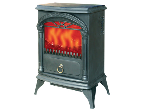 Elettrostufa "Ambiente" con effetto fuoco vivo. Scocca in polypropilene. Potenza 900/1800 Watt, tasto regolabile ON/OFF, con termostato, luminosità regolabile, intensità fiamma regolabile. Dimensioni 41x25xH55 cm..