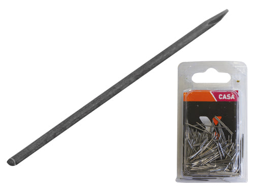 Chiodo a spillo in acciaio per cornici. In confezione blister 300 pezzi. Ã 0,9x20 mm.