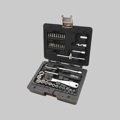 Attacco 1/4". Valigetta in materiale plastico. Contenuto: 13 chiavi a bussola (mm 4÷14), 1 cricchetto reversibile, 1 prolunga mm 50, 1 prolunga mm 100, 1 snodo cardanico, 1 leva a T con quadro scorrevole, 1 portabussole con impugnatura, 4 chiavi maschio esagonale (mm 1,3-1,5-2-2,5), 1 raccordo da attacco esagonale 1/4" femmina a attacco quadro 1/4" femmina, 3 inserti a taglio (mm 0,6x4-0,8x5,5-1,2x6,5), 3 inserti a croce Phillips (PH1-PH2-PH3), 3 inserti a croce Pozidriv (PZ1-PZ2-PZ3), 4 inserti esagonale (mm 3-4-5-6), 5 inserti Torx (T10-T15-T20-T25-T30).