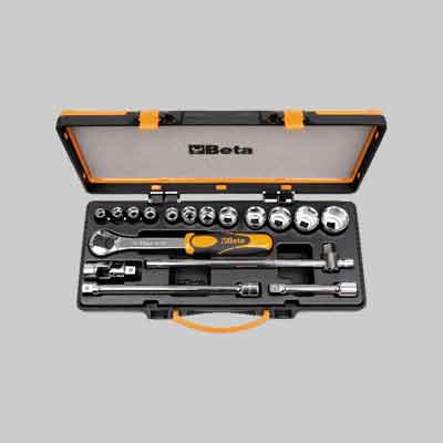 Attacco 1/2". Valigetta in lamiera. Contenuto: 12 chiavi a bussola (mm 10÷32), 1 prolunga mm 125, 1 prolunga mm 255, 1 snodo cardanico, 1 leva a T con quadro scorrevole, 1 cricchetto reversibile.