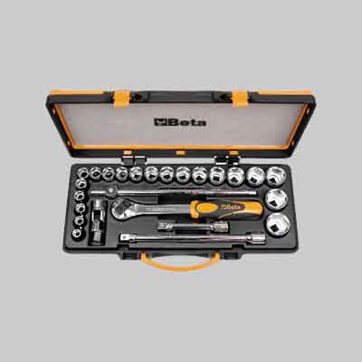 Attacco 1/2". Valigetta in lamiera. Contenuto: 20 chiavi a bussola (mm 10÷32), 1 prolunga mm 125, 1 prolunga mm 255, 1 snodo cardanico, 1 leva a T con quadro scorrevole, 1 cricchetto reversibile.