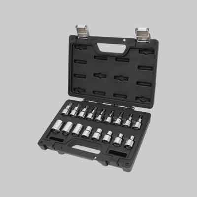 Attacco 1/2". Valigetta in materiale plastico. Contenuto: 8 chiavi a bussola per viti con testa a profilo Torx (E10÷E24), 9 chiavi a bussola maschio Torx (T20÷T60).