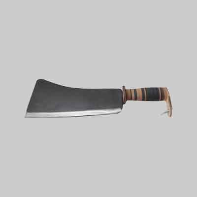 Lama in acciaio forgiato e temprato. Manico in cuoio con gancio.