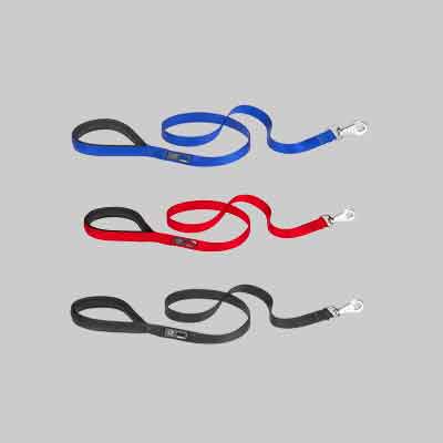 In nylon resistente. Impugnatura confortevole con imbottitura soft e pratico moschettone in acciaio cromato che previene l'attorcigliamento.