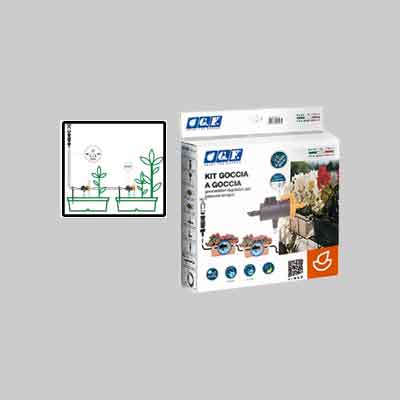 Assortimento completo per balcone, terrazzo o piccole aiuole. Composto da: 1 riduttore di pressione, 1 presa rubinetto 3/4", 20 m tubo capillare, 4 raccordi a T, 4 raccordi a L, 12 astine di supporto, 10 gocciolatori di linea, 2 gocciolatori di fine linea, 2 tappi fine linea.